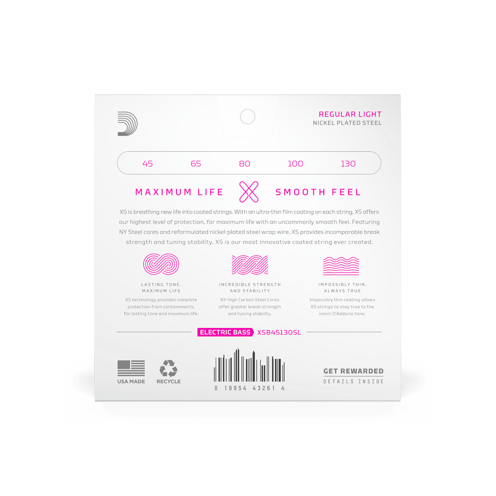 D’Addario XS Nickel Bass Strings combine premium nickel-plated steel wrap wire with an ultra-thin protective coating to deliver a smooth feel, maximum lifespan, and punchy, well-balanced tone.
